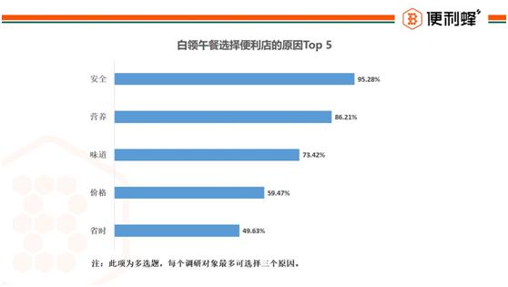 当问及为什么选择到便利店吃午餐时,吸引白领消费的首要原因是“安全”,获得95.28%的认可,其次是“营养”,有86.21%的关注量。白领们对“味道”的重视度甚至高于“价格”。