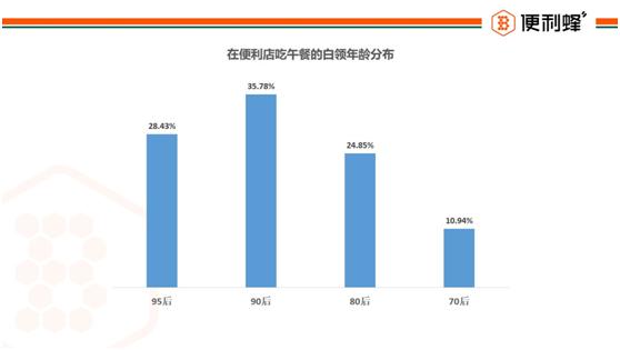 便利蜂通过全国20个城市1600余家门店对消费者进行调查。报告显示,90后、95后已经成为便利店午餐的消费主力,分列第一、二位,占比35.78%和28.43%,80后排在第三,占24.85%,70后占10.94%。