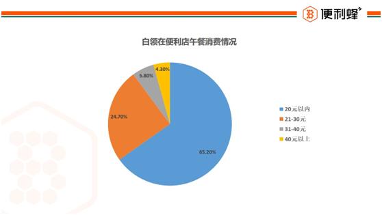 便利蜂综合各地情况,65.2%的消费者午餐费用控制在20元以内,其次是21-30元,占比24.7%,仅有差不多10%的消费者平均午餐费用在30元以上。