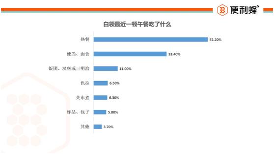 超五成白领最近一顿午餐吃了便利蜂的热餐,超三成吃了便当、面食,另有11%的人选择了饭团、汉堡和三明治等鲜食,就连炸品、包子和关东煮等早餐或宵夜类食品也出现在不少人的午餐清单里。