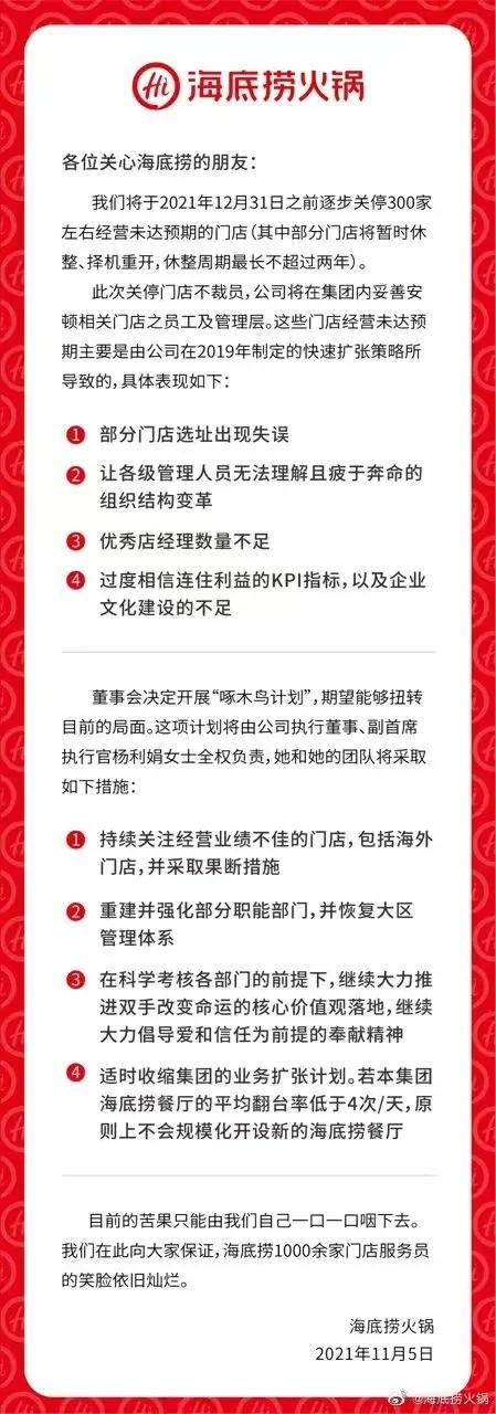 海底捞微博也发了一则公告。公告显示,关停门店是公司2019年制定的快速扩张策略所导致的,具体表示有门店选址失误,让各级管理人员无法理解且疲于奔命的组织结构变革、优秀店经理数量不足、过度相信连住利益的KPI指标,以及企业文化建设的不足。