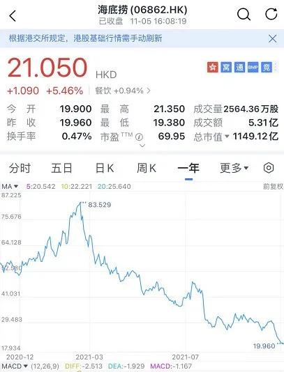 2018年9月26日,餐饮“航母”海底捞在港交所挂牌,发行价为17.8港元/股,盘中一度飙升至19.64港元/股,市值摸高1000亿港元。至2021年2月,海底捞股价达到历史新高的80多港元/股,总市值曾一度接近4700亿港元。