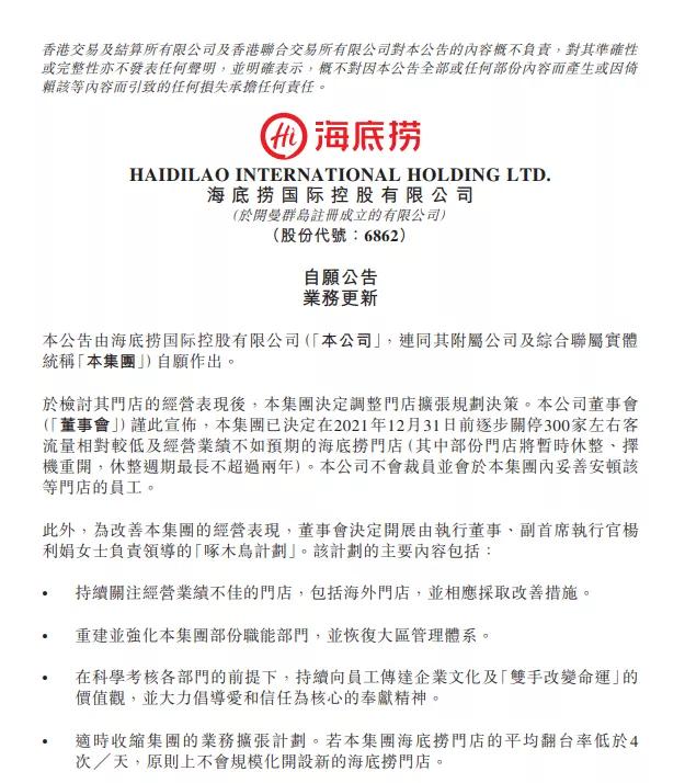海底捞11月5日晚间公告,决定在2021年12月31日前逐步关停300家左右客流量相对较低及经营业绩不如预期的海底捞门店。其中部分门店将暂时休整、择机重开,休整期最长不超过两年。公司不会裁员并会于公司内妥善安顿关停门店的员工。